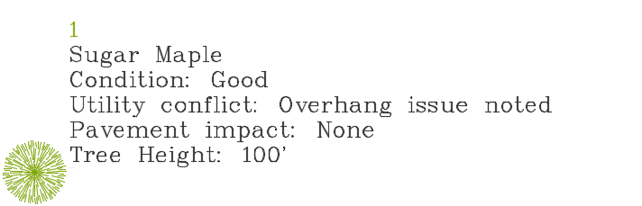 The following illustration shows a point labeled with tree data that is set up in a property set.