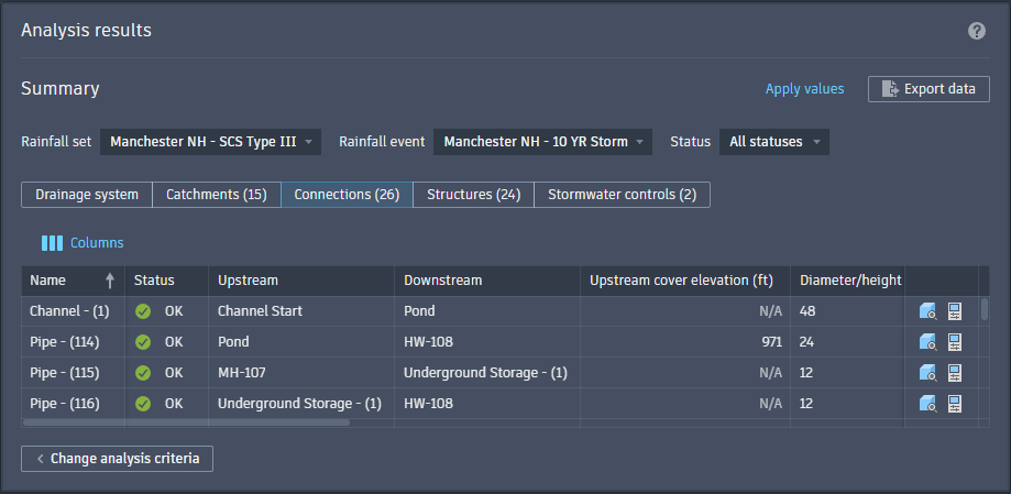 Much like the initial system check for errors and warnings, you can step through individual objects in your drainage system and adjust for potential problematic issues. Each category (displayed as tabs above the data table) has its own unique analysis data and status warnings. Step through any requiring attention and use the following tools for correction.