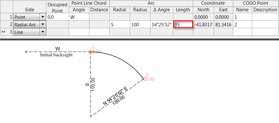When entering data for radial arcs, you must specify a radial direction and a radius and either a delta angle or length. The value you input directly for delta angle or length is shown in regular font and calculated values are shown in italics.