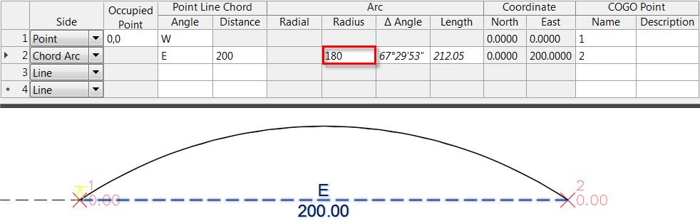 When entering data for chord arcs, you must specify an angle and distance and then you can specify either a radius, delta angle or length. The value you input directly for radius, delta angle or length is shown in regular font and calculated values are shown in italics. In the following illustration, 180 was entered for the radius and the delta angle 67 ° 29' 53" and length 212.05 are calculated.