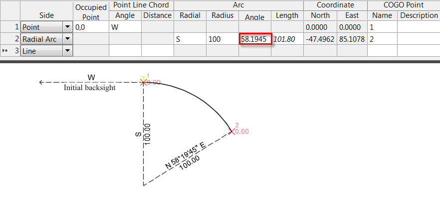 In the following illustration, 58.1945 was entered for the delta angle and the length 101.80 is calculated.