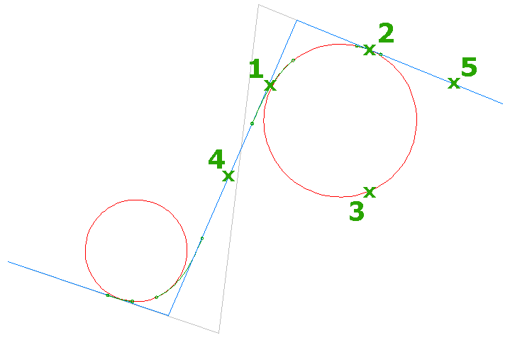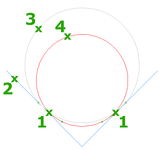 Next, Autodesk Civil 3D calculates curves (1) based on the sequence of the points and the specified Maximum Radius For Curve Detection setting. Autodesk Civil 3D approximates the curvature by linking the sample points together with linear segments. To increase the accuracy when using either feature lines or AutoCAD elements, intermediate sample points may be either weeded from the original input data or created between each pair of sample points. When a sequence of points has a radius that is greater than this setting, the points will form a straight (2). The apparent intersection of the straights (3) are the intersection points for the alignment straights.