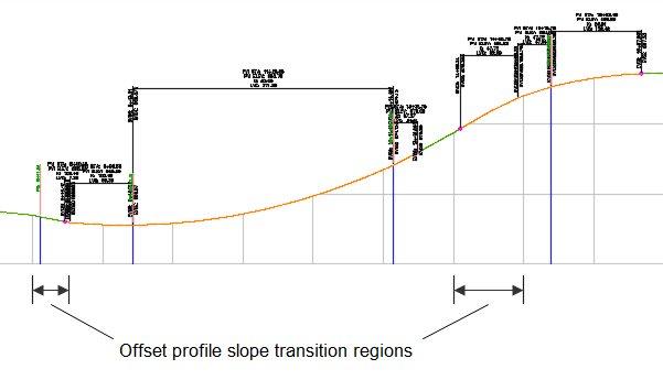 - Parabolas and circular curves in the slope transition area will use the K or R of the offset profile curves that was calculated prior to the slope transition being applied.