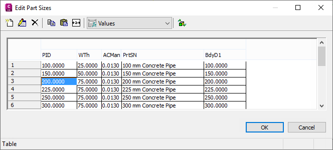 - In the Edit Part Sizes dialog box, click the Autosize Column Text button then find the Pipe Inner Diameter (PID) value and the Wall Thickness (WTh) values.