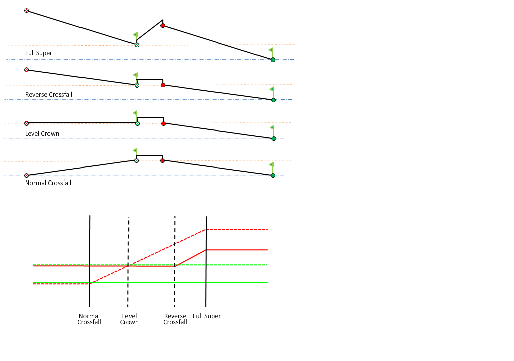 For an explanation of superelevation diagrams, see About Superelevation Axis of Rotation Pivot Methods.