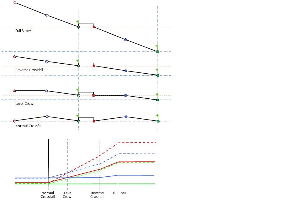 For an explanation of superelevation diagrams, see About Superelevation Axis of Rotation Pivot Methods.