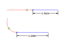 The line is drawn from the end of the object that is closest to the selection point. Specify a distance by picking two points or entering a value. The line that is drawn from an end of an arc will be drawn straight.