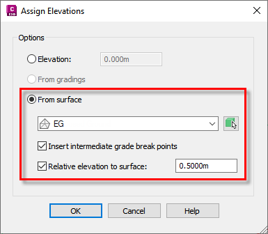 In the Assign Levels dialog box, select the From Gradings option. This option is similar to the From Surfaces option but acquires the levels directly from any gradings that it overlaps in the site that the feature line is to be created in.