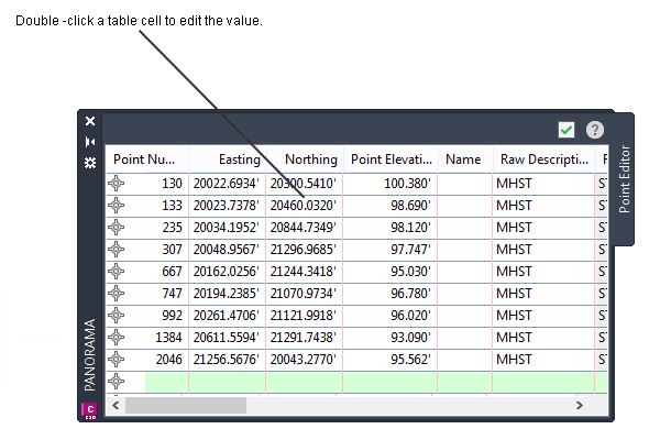 Some object types, such as alignments and profiles, use the Panorama window to display a table of elements that make up that object.