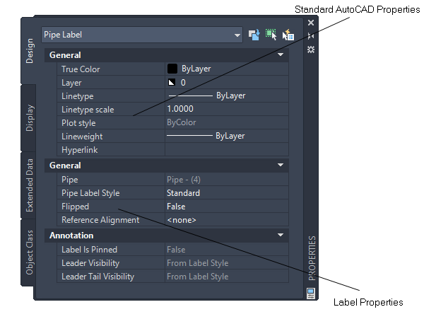 You can use this dialog box to review and edit AutoCAD properties, such as the layer on which the object is drawn. You can view the style assigned to the object, and can also change it here. You can also edit an object style on the Settings tab of Toolspace. Right-click the object style. Click Edit to open the <feature> Style dialog box.