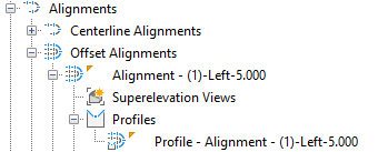 The offset alignments are added to the Offset Alignments collection in Prospector. Offset profiles are created in the Profiles collection inside the named offset alignment collections.