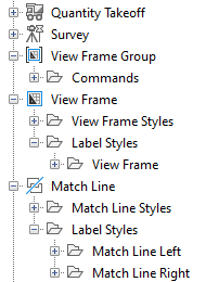 View frame groups are non-graphical objects that manage a collection of view frames and match lines. At the view frame group level, you can set the display and label style defaults for view frames and match lines. |