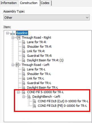 | Layout Width | 20.0000’ | Specifies the length of the line that is drawn to represent this subassembly in layout mode. This parameter, in combination with the Layout Gradient parameter, allows you to position the ConditionalCutOrFill subassembly and subassemblies that are attached to it, but does not display or have any effect in the corridor model. |