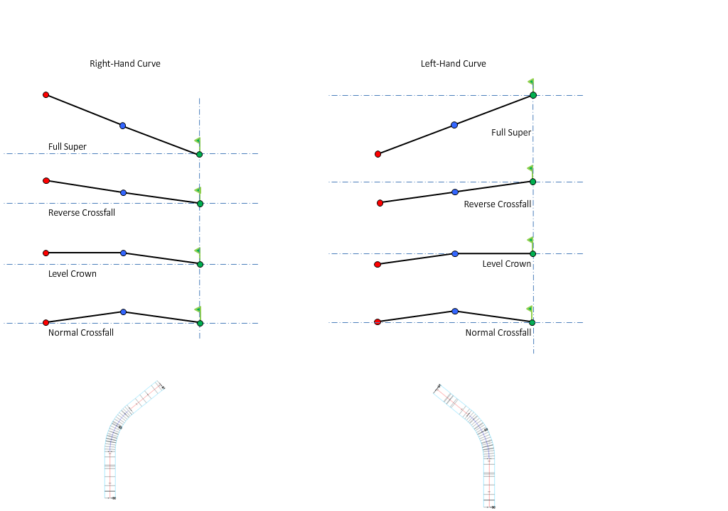 For an explanation of superelevation diagrams, see About Superelevation Axis of Rotation Pivot Methods.
