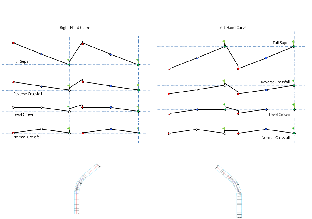 For an explanation of superelevation diagrams, see About Superelevation Axis of Rotation Pivot Methods.