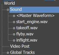 The Open dialog automatically opens to the \sounds folder in your active project folder. If the sound files flyby.wav, inflight.wav, start_engine.wav, and takeoff.wav are not there, navigate to the folder where you saved your ProSound tutorial scene files.