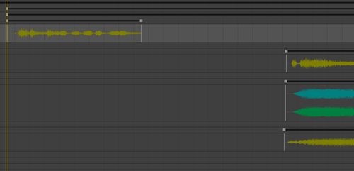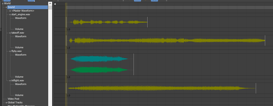 The first, second, and fourth sound tracks were recorded in mono and show a single waveform. The third sound track, flyby.wav, was recorded in stereo and displays two waveforms, one for its left and another for its right channel.