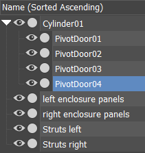 As you perform the preceding steps, the hierarchy in the Scene Explorer panel updates to show that the doors are now children of