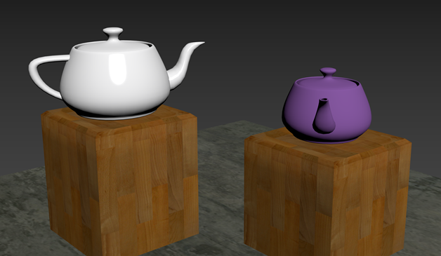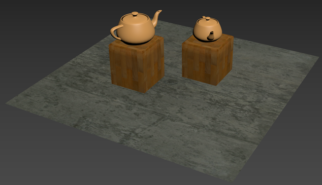 3DS Max contains lots of different presets for materials. For example, the materials for the podiums and the floor are both presets. Feel free to experiment with the presets. You could even have a rough concrete teapot (though I wouldn't recommend drinking from it).