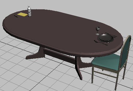 The scene contains a table, a chair, and two place settings: one for eating a meal and another for attending a meeting at work.
