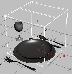 The container and its contents appear in the viewports, in the same location from which you saved them. The container is closed and selected.