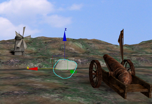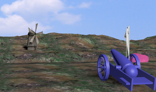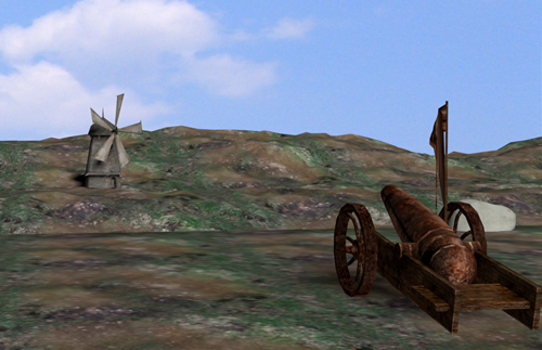 You add realism to scene objects by adding materials to their surfaces. Material texture can include information from bitmap images, as well as bump maps for a 3D effect. In this tutorial the battlefield terrain, as well as the rock, cannon, and windmill, all get their appearance from bitmap texture mapping.
