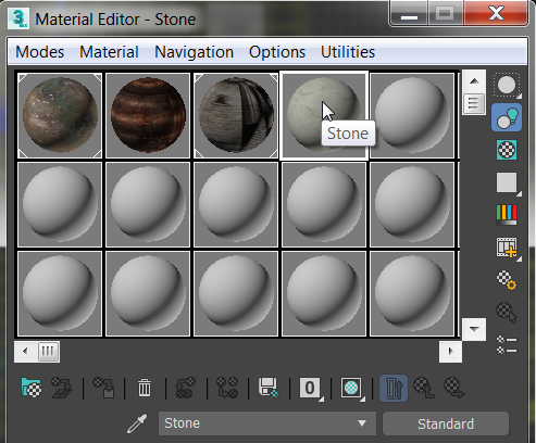 If at first you can't see the sample slot for the Stone material, right-click one of the sample slots and choose 5 X 3 Sample Windows to display more of the slots.