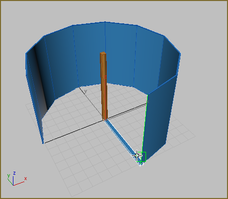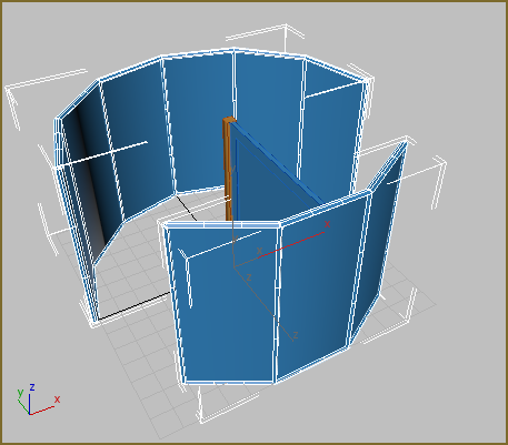 To create the revolving door, you will rotate the right enclosure panel temporarily into a different position, then you will create a pivot door using snaps between the hub and the right enclosure panels. You edit the material on the door, then instance the door to create a wheel of four doors.
