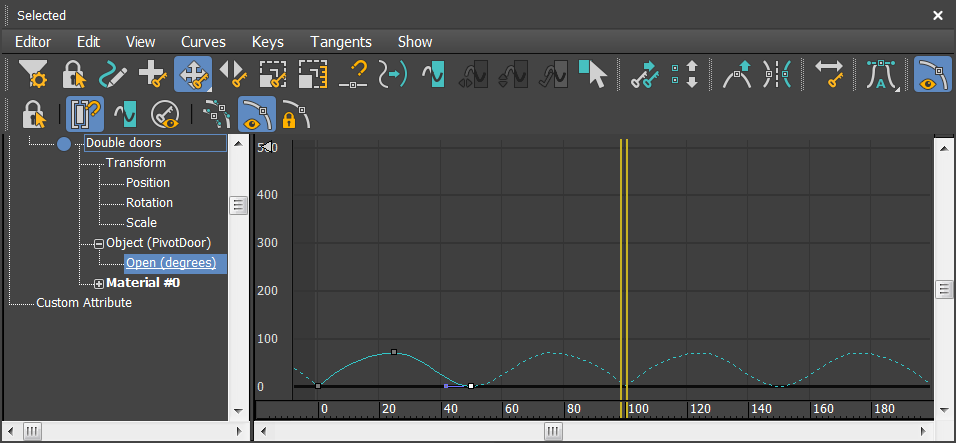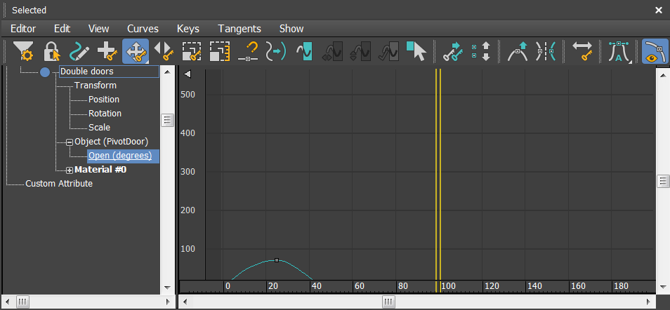 A Track View - Curve Editor window opens with the Double doors Open parameter highlighted.