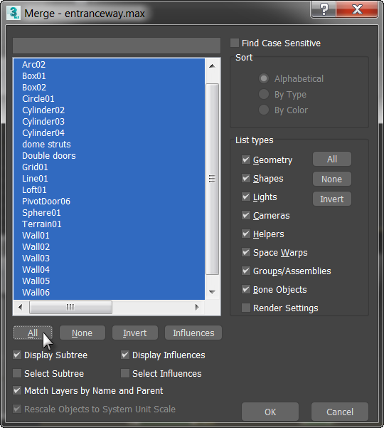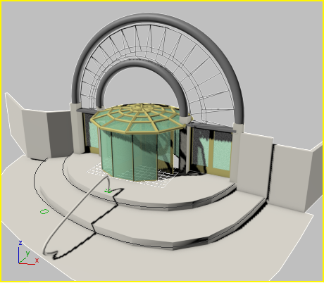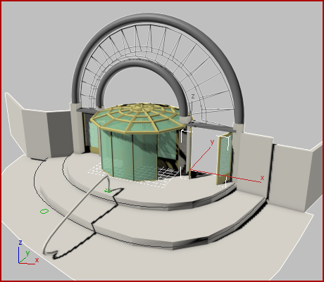 The revolving door seems lonely, spinning by itself in the viewport. You can use the Merge command to put this revolving door into context, by merging in a scene of an entranceway.