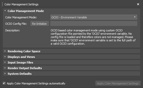 The Color Management setup in 3ds Max 2025 has explicit modes to use different OCIO configurations: a default mode, a custom mode, and a mode to follow the OCIO environment variable. MAXtoA passes this mode setting on to the Arnold renderer so that Arnold uses the OCIO environment variable override only when 3ds Max is explicitly set in the OCIO - Environment Variable mode.