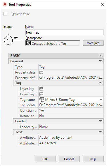 identify the type of tool click Type, and select Tag to identify the tool as a schedule tag, or select Property set data to specify that the tool attaches property data without displaying a tag. When property set data is attached to an object, properties display in the schedule and on the Properties palette without displaying a tag on the object.