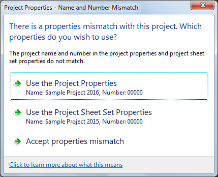 | continue to use different names for the project and the project sheet set | select Accept properties mismatch. |