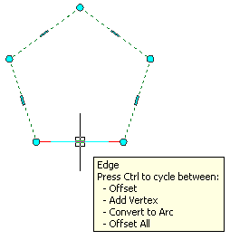 The Edge grip has four edit modes: Offset, Add Vertex, Convert to Arc, and Offset All. The default mode is Offset, which offsets the selected edge in a direction that is perpendicular to the midpoint of the edge. Depending on the shape of the AEC polygon and the edge you choose to modify, neighboring lines are extended or trimmed, and new lines are added, as necessary.