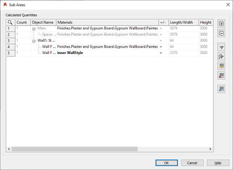 - The calculation sign +/- shows whether a sub area is subtracted from (minus) or added to (plus) the main area. Automatically detected sub areas like openings in walls are by default in (-), which means they are subtracted from the wall surface as they are reducing the material requirement.