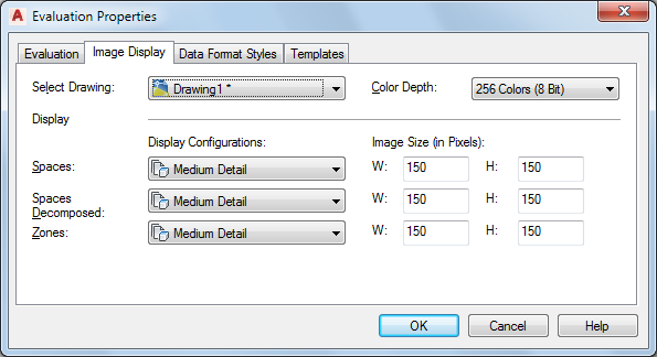 - For each object category (Spaces, Spaces Decomposed, and Zones) select the desired display configuration, and specify the desired width and height for the image size: