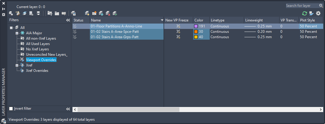 - A predefined filter named Viewport Overrides is displayed in the tree view where all layers with viewport overrides are listed.
