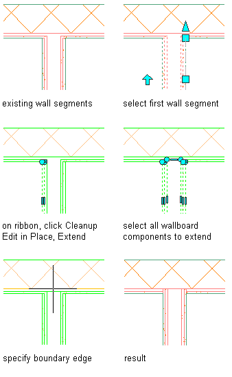 Use this procedure to modify a wall intersection by extending a component. The extension boundary can be a line, arc, circle, polyline, or wall component edge.