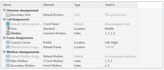 After you’ve created element definitions for a curtain wall style, you can assign those definitions to each of the curtain wall element types: divisions, cell infills, frames, and mullions.