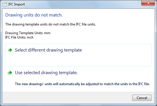 If the template (DWT file) you select does not have the same units as the IFC file being imported, you are given the choice to continue with that template or select a different template. If you choose to continue with the selected template, the units in the IFC file will override the units in the template file.