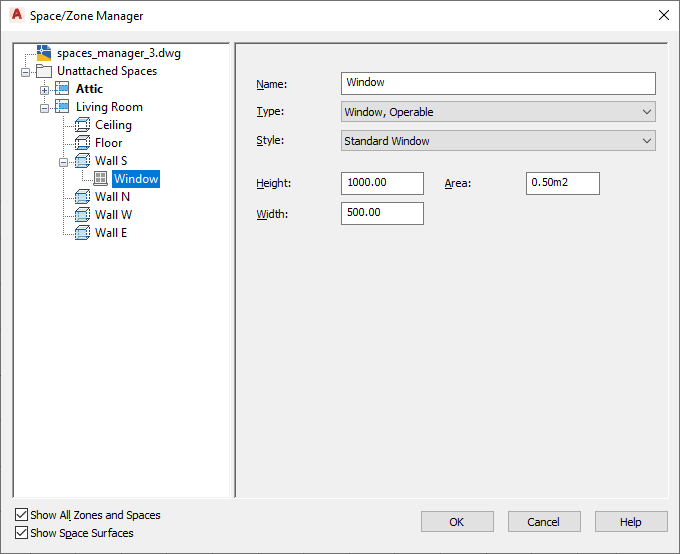 | change the area of a surface opening | enter values for Area, Height, or Width of the opening. Note: For a 3D freeform space opening, you cannot edit the height or width on this worksheet. You can change the width and height of a 3D freeform surface opening using grips.