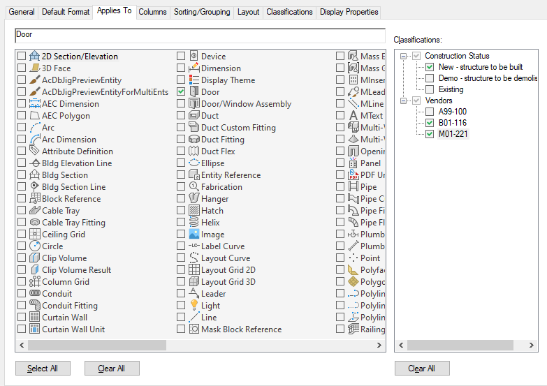 For example, if you want to schedule only doors with a New construction classification and a vendor with preferred classification, you can specify those criteria in the schedule table style. Only doors that meet both criteria can be included in the schedule table.