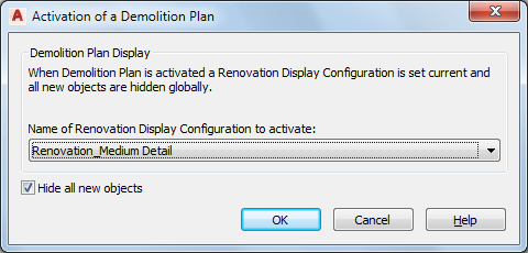 By switching between renovation plan types, you can work in different “views” of the drawing, and avoid errors often incurred when editing multiple drawings. Display settings for the demolition plan type are located in the Renovation Options dialog box. By default, yellow is assigned to demolished objects.