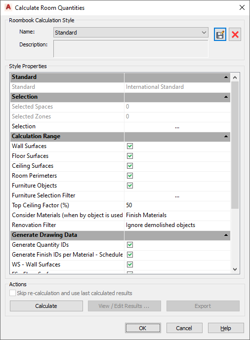 - All settings which are made in this dialog box (selection, range, export), are stored in the current room quantity calculation style name. The Calculation Settings however, are not stored in the style, but globally in the drawing. If needed, you have to change them prior to a new calculation.