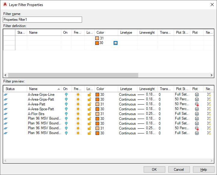 You can also specify more than one set of criteria for a property filter. For example, you can create a filter that will include all frozen red layers and all frozen blue layers. Boolean AND/OR logic is applied to the filter definitions to determine which layers to include. A layer must meet all the criteria in a single row in order to be included in the filter. Continuing with the example, a layer must be frozen and red to be in the filter. Multiple rows offer alternative criteria. In the example below, a layer must be overridden with the color 30 or it must be overridden with the color 31.