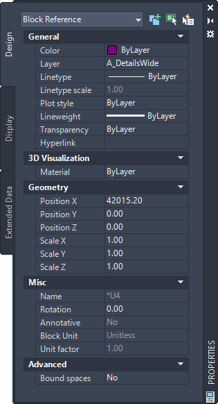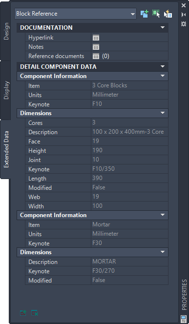 The following image shows the Extended Data tab of the Properties palette for a concrete masonry unit detail block.
