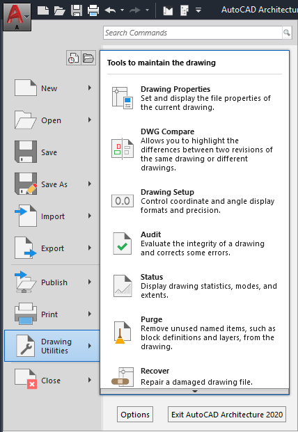 The application menu contains basic commands pertaining to the drawing as a whole, such as Open, Save, Print, and Export. Like the menu browser it replaces, the application menu is accessed by clicking
