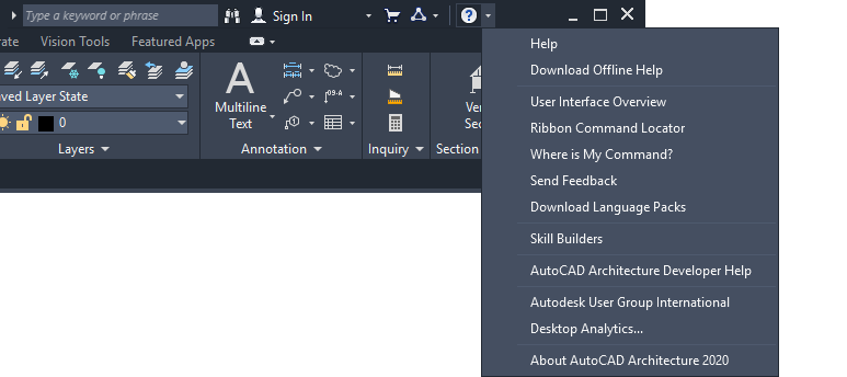 With the removal of the menu bars, the commands to access Help features have been moved into the InfoCenter at the top right of the application window. Here, you can find the online resources of InfoCenter and the Help menu, which lets you access Help, Tutorials, and other interactive resources.