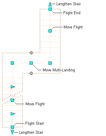 Multi-landing stair Flight Start and End, Move Flight, Move Multi-Landing, and Lengthen Stair grips