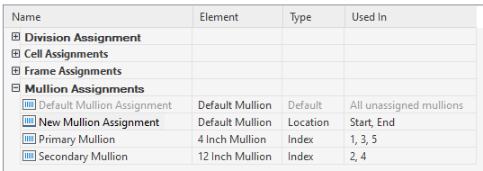 A new mullion assignment is displayed in the list of mullion assignments.